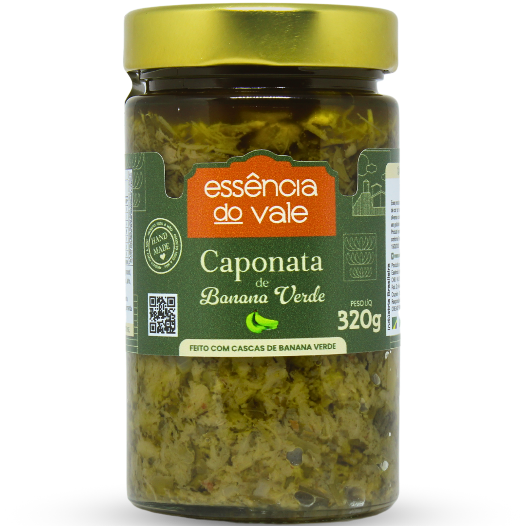 Experimente a Caponata de Casca de Banana Verde da Essência do Vale, um antepasto vegano perfeito para sanduíches, canapés ou em preparos de massas. Feita com a Casca da Banana Verde e ingredientes naturais, esta caponata é uma escolha saudável e saborosa para o seu aperitivo.
