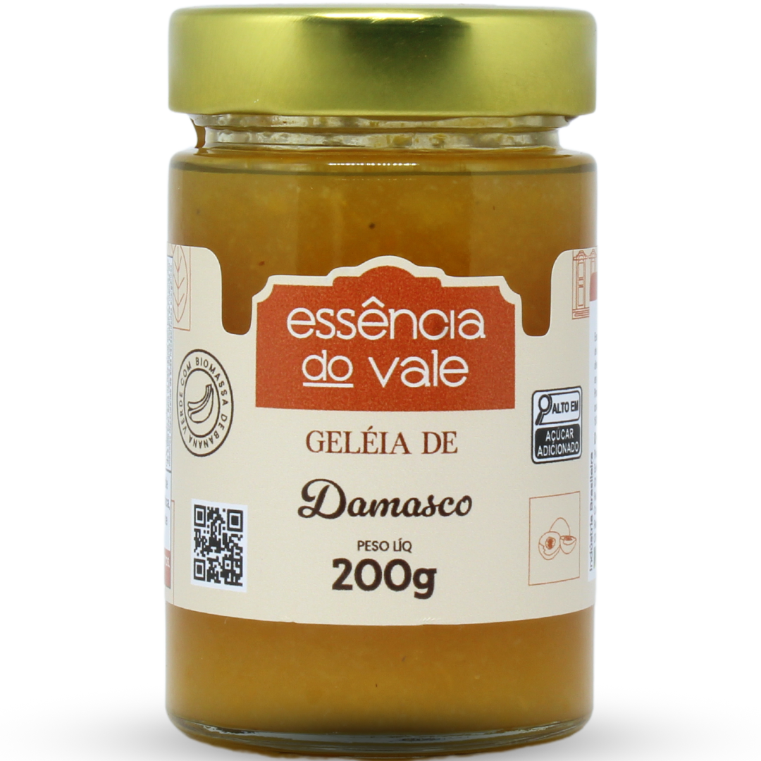 A Geleia de Damasco da Essência do Vale é produzida artesanalmente, com damasco seco e reidratado, enriquecida com 4% de biomassa de banana verde, consistência de um doce de corte, sem adição de corantes, aromatizantes e conservantes químicos.