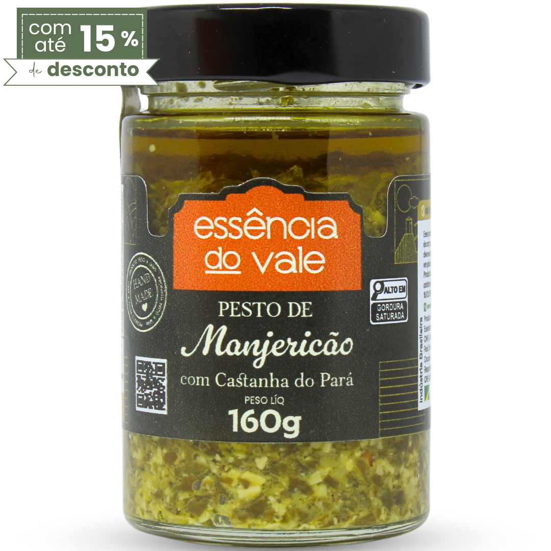 Ingredientes: Óleo de Girassol, folhas de manjericão, queijo parmesão, castanha-do-Pará, vinagre de maçã, azeite de oliva extra virgem, alho, sal temperado (sal grosso, alho, alecrim, tomilho, pimenta dedo de moça, louro), pimenta dedo de moça. ALÉRGICOS: CONTÉM DERIVADOS DE LEITE E CASTANHA-DO-PARÁ.